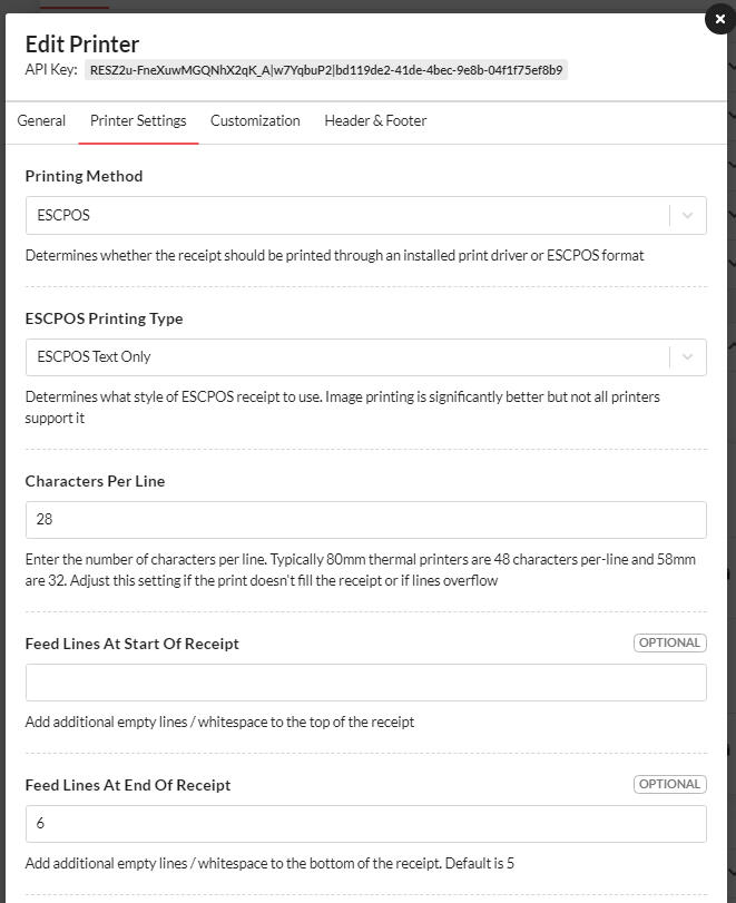 Printer name - This is the name that the printer will show inside of your online ordering system.API Key - This needs to be copied from the printer settings inside of your online ordering system.